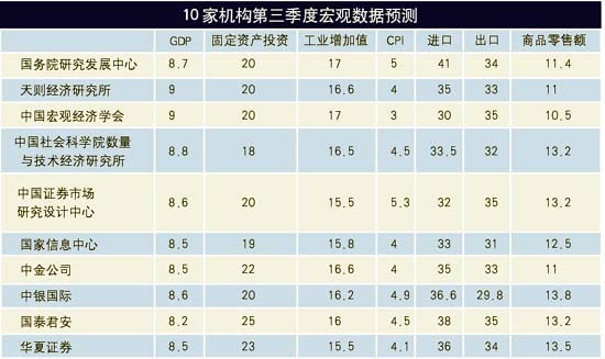 宏觀調控已經取得明顯效果的說法得到了參與預測機構比較一致的認同,他們對三季度各項經濟指標的增長速度的預測明顯低于上半年,其中,對GDP增長預測的平均值為8.6%。