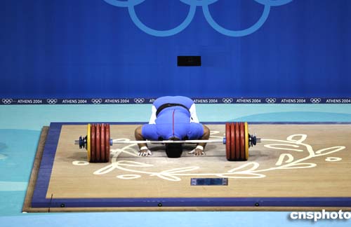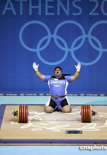 圖為伊朗選手Hossein Reza Zadeh舉起263.5公斤的重量,獲得男子105公斤以上級(jí)舉重冠軍。