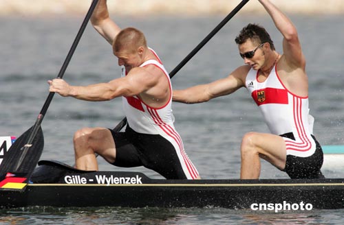 當(dāng)?shù)貢r(shí)間八月二十七日,在雅典奧運(yùn)會男子雙人劃艇一千米比賽中,德國選手GILLE與WYLENZEK獲得冠軍。中新社記者:毛建軍
