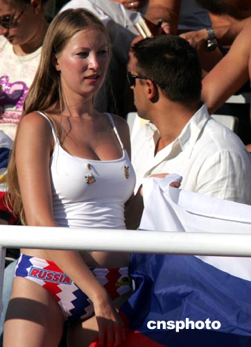 當(dāng)?shù)貢r間8月27日下午,雅典奧運(yùn)會男子水球比賽進(jìn)入白熱化階段,志在奪取金牌的俄羅斯隊(藍(lán)帽)以5比7負(fù)于匈牙利隊,從而無緣金牌。俄羅斯的球迷人數(shù)雖少,但是熱情四射的女球迷依然奪人眼目。中新社記者:任晨鳴