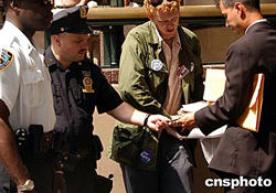 當?shù)貢r間八月二十七日,距離美國共和黨大會開幕還有三天,紐約麥迪遜廣場花園附近已經(jīng)開始嚴密警戒,圖為一名年輕的布什反對者(右二)受到警察的盤查。作者:趙海燕