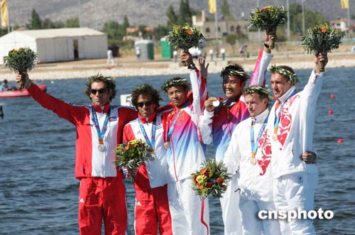 當(dāng)?shù)貢r(shí)間八月二十八日,中國選手孟關(guān)良、楊文軍在雅典奧運(yùn)男子五百米雙人劃艇比賽中奪得金牌。中新社記者:毛建軍