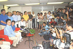 民建聯(lián)主席馬力早時(shí)在內(nèi)地接受切除結(jié)腸癌手術(shù)﹐28日出院返回香港﹐民建聯(lián)中常委在總部設(shè)歡迎會(huì)﹐歡迎馬力主席手術(shù)成功返港﹐蔡素玉向馬力送花。中新社記者:趙振清
