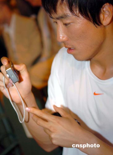新“飛人”劉翔在啟動(dòng)儀式上擺弄數(shù)碼相機(jī)。