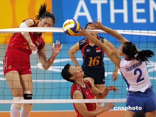 在雅典奧運(yùn)會女排賽中,中國女排以進(jìn)攻強(qiáng)、防守好、戰(zhàn)術(shù)靈活多變等特點(diǎn)獨(dú)領(lǐng)風(fēng)騷,特別是與俄羅斯隊(duì)的決賽中,在先失兩局的情況下,不慌不亂,連扳三局,取得了最終的勝利,再次奪得了奧運(yùn)會金牌。