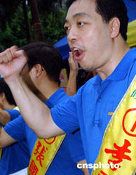 八月二十九日,香港民建聯(lián)舉行2004立法會(huì)選舉誓師大會(huì),剛剛手術(shù)出院的民建聯(lián)主席馬力與港島區(qū)候選人一起在誓師大會(huì)上,為進(jìn)軍2004立法會(huì)選舉造勢(shì)。作者:錢興強(qiáng)