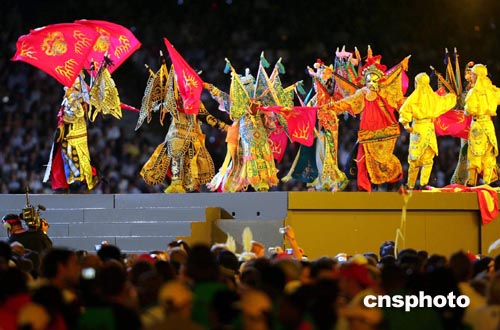 展現(xiàn)中國文化,京劇不可或缺。來自大連的十三歲少年汪宇,與另外五名同學(xué)揮舞旌旗表演了武戲。隨后,一個(gè)巨大的紅燈籠狀舞臺緩緩升起,一名中國小女孩清唱《茉莉花》,“welcome to beijing”,她純真、清脆的聲音表達(dá)出中國人民最衷心的愿望。