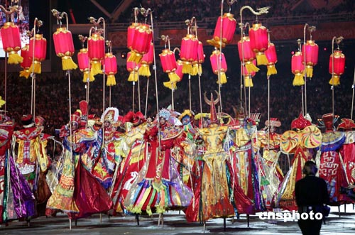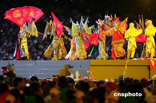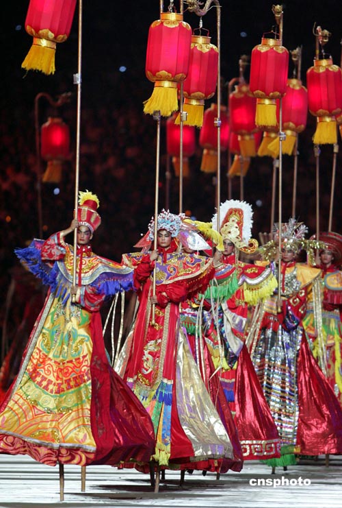 圖為中國(guó)演員在閉幕式上表演,宣傳將于二00八年在北京舉行的下一屆奧運(yùn)會(huì)。