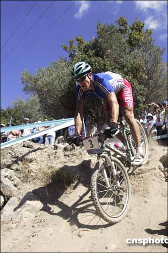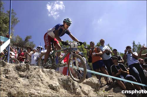 在當(dāng)?shù)貢r(shí)間28日進(jìn)行的山地男子自行車(chē)越野比賽中,法國(guó)選手阿布薩隆用時(shí)2小時(shí)15分03秒,獲得冠軍。
