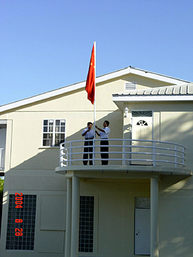 中新網(wǎng)8月30日電 據(jù)中國外交部網(wǎng)站消息:8月25日,中國駐多米尼克國大使館正式進(jìn)駐大使館館舍。8月26日清晨,王新平臨時代辦和王勇三秘第一次在使館升起鮮艷的五星紅旗。