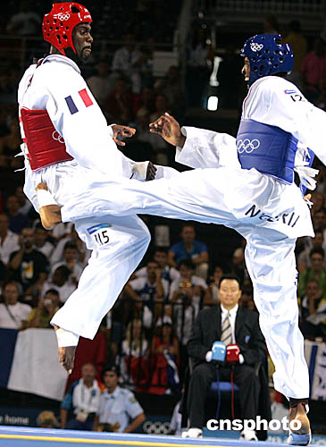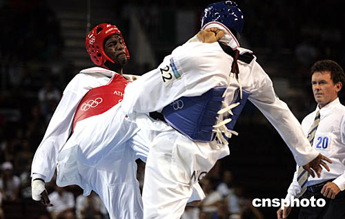 圖為尼日利亞選手Chika Chukwumerije和法國(guó)選手Pascal Gentil在男子80公斤級(jí)跆拳道比賽中,展開(kāi)激烈對(duì)抗。