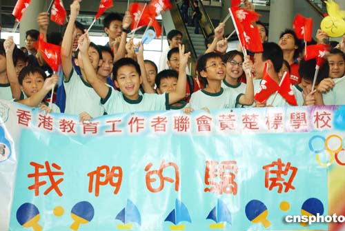 在香港國(guó)際機(jī)場(chǎng)舉行的歡迎儀式上,眾多香港小朋友舉著標(biāo)語(yǔ)熱烈歡迎香港奧運(yùn)代表團(tuán)返港。作者:錢興強(qiáng)