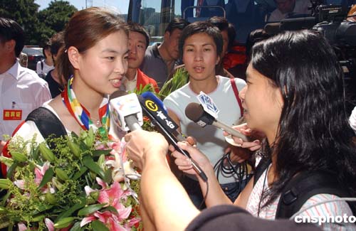 八月三十一日,中國奧運健兒載譽(yù)回國,在北京首都國際機(jī)場受到熱烈歡迎。圖為奧運跳水冠軍吳敏霞在機(jī)場接受媒體采訪。中新社記者:武仲林