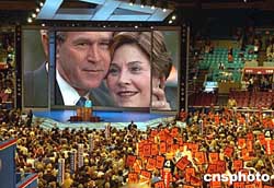 布什的兩個雙胞胎女兒芭芭拉和詹娜出現(xiàn)在共和黨大會的講臺上,為爸爸衛(wèi)冕總統(tǒng)助陣。作者:趙海燕