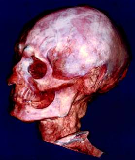 在實施木乃伊面容復原計劃時,由菲德瑞克博士領導的專家小組選中了一個3000歲的木乃伊。他生活在公元前945-前715年,生前是一個技術工人。該木乃伊于1900年在皇后谷地區(qū)被發(fā)掘出來,隨后又被送入埃及博物館。“手術”過程中,科學家們把木乃伊置于掃描儀上,以平均每27.4秒顯示335幀圖像的速度進行掃描。所有的圖像都被存入電腦的記憶系統(tǒng)中,最后使用特殊軟件在電腦中將裹尸布揭去。隨后,科學家們根據圖像數據,運用整形技術將頭骨復原。最后,他們以暴露在木乃伊裹尸布之外的面部皮膚和肌肉作為參照依據,用特殊材料制作成面部肌肉、耳朵、嘴巴等。
