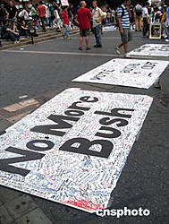 九月二日下午,在曼哈頓中城聯(lián)合廣場公園內(nèi),鋪著“把布什選下去”的標(biāo)語,希望征集行人簽名。美國總統(tǒng)大選臨近,恰逢共和黨全國代表大會正在紐約舉行,民眾在市內(nèi)公園里舉行很多自發(fā)的反戰(zhàn)、反布什示威活動。作者:江雪晴