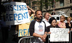 美東時(shí)間九月二日,美國(guó)總統(tǒng)布什來(lái)到紐約曼哈頓,準(zhǔn)備出席在這里舉行的共和黨全國(guó)代表大會(huì)閉幕式。當(dāng)總統(tǒng)車(chē)隊(duì)經(jīng)過(guò)被全線封鎖的市中心街道時(shí),路邊一位婦人打著“支持布什”的標(biāo)語(yǔ)。但他身邊的男子展開(kāi)更寬大的橫幅,上書(shū)“法西斯分子該悔悟了”。作者:龔文謨