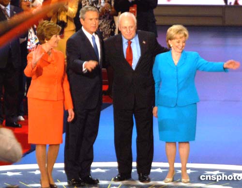 當?shù)貢r間九月二日晚,美國總統(tǒng)布什在共和黨大會閉幕式上正式接受共和黨總統(tǒng)候選人提名后,與第一夫人勞拉以及美國副總統(tǒng)切尼夫婦一起向全場致意。作者:趙海燕