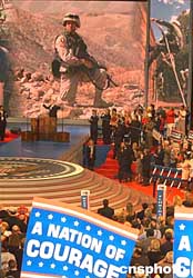 在美國共和黨大會閉幕式上,伊拉克戰(zhàn)場總指揮弗蘭克斯發(fā)表演講,為布什發(fā)動的反恐戰(zhàn)爭辯護(hù),突出反恐主題。作者:趙海燕