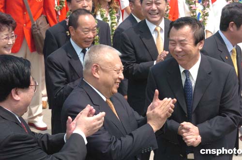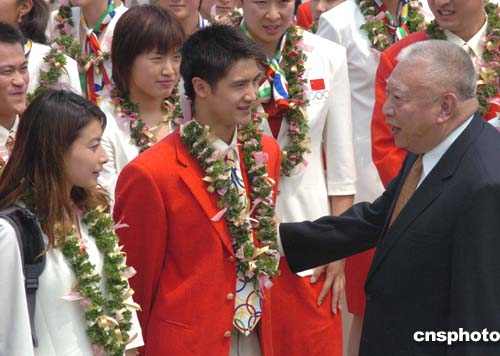 香港特區(qū)行政長(zhǎng)官董建華到場(chǎng)歡迎以袁偉民為團(tuán)長(zhǎng)的中國(guó)奧運(yùn)金牌代表團(tuán)訪問香港。中新社記者:錢興強(qiáng)