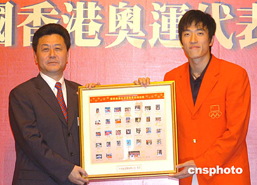 國(guó)家奧運(yùn)金牌代表團(tuán)團(tuán)長(zhǎng)袁偉民向中國(guó)香港體育協(xié)會(huì)暨奧林匹克委員會(huì)會(huì)長(zhǎng)霍震霆致送紀(jì)念品。