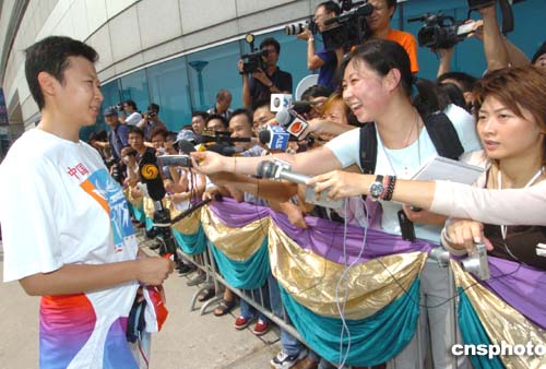 國家奧運(yùn)金牌代表團(tuán)9月7日在香港展開觀光之旅,9時(shí)45分抵達(dá)灣仔金紫荊廣場參觀,吸引大批市民圍觀,圖為女排隊(duì)長馮坤現(xiàn)場接受媒體采訪。作者:趙振清