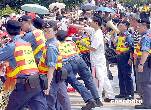 國家奧運金牌代表團9月7日在香港展開觀光之旅,金牌選手分別在香港多處名勝景點參觀,所到之處均深受廣大市民熱烈歡迎,在雅典奧運勇奪跳水男子雙人10米高臺金牌的“跳水王子”田亮在尖沙咀星光大道參觀,并為小學生簽名留念,在場民安隊員加強護欄。作者:鄧慶樂
