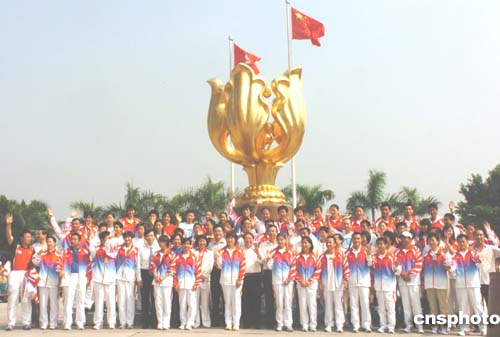 代表團(tuán)首先在金紫荊雕像前來個大合照,然后繞場一周,一一與在場市民握手和簽名,他們所經(jīng)之處,均引起一陣哄動,在場工作人員不停呼吁地市民注意安全和保持秩序。在烈日下,有“靚女”之稱的女排姑娘周蘇紅、劉亞男把手都簽酸了,仍滿足不了熱情的球迷。代表團(tuán)逗留了約半小時,在市民歡送聲中離開,繼續(xù)其他參觀訪問。