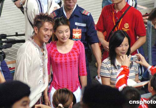 大匯演雖然晚上七時(shí)才開始,但因場(chǎng)內(nèi)不設(shè)劃位,故昨天上午八時(shí)已有人排隊(duì),希望能盡早霸占有利位置,至下午四時(shí)半,場(chǎng)外排隊(duì)市民已聚集逾一千人,大會(huì)決定提早于四時(shí)四十五分讓市民分批入場(chǎng),先入場(chǎng)者更可一睹選手的彩排情況,入場(chǎng)者皆獲派小國(guó)旗及區(qū)旗助興。而董建華、霍英東、曾憲梓及中聯(lián)辦主任高祀仁等則在貴賓席觀看。