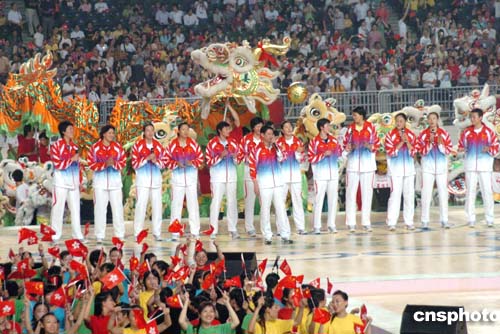 9月7日晚上,位于快活谷的香港大球場成為名副其實的“歡樂之谷”,國家奧運金牌選手和數(shù)萬名香港市民會聚在此,共享中國在雅典奧運會奪金的喜悅和榮光!皧W運精英大匯演”在這里拉開帷幕。圖為女排教練陳忠和帶領(lǐng)全體選手高歌,為晚會推向高潮。作者:洪少葵