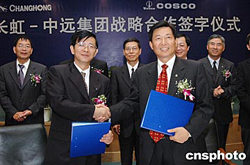 九月八日,長虹集團和中遠集團在四川綿陽簽署戰(zhàn)略合作協(xié)議書,雙方將在國際運輸、物流、服務、信息方面展開更深更廣的合作。圖為長虹董事長趙勇(左)與中遠集團總裁魏家福(右)簽定戰(zhàn)略協(xié)議。作者:陳紅