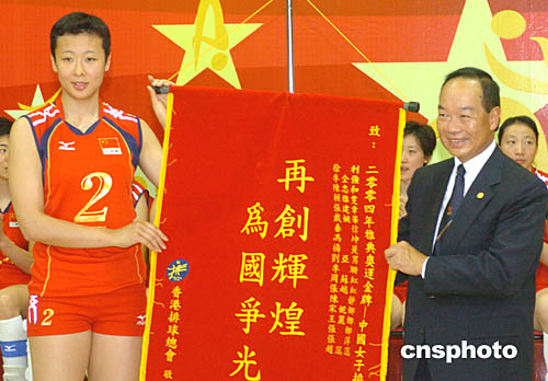 香港排球總會會長許晉奎(右)8日在香港修頓體育館向中國女排贈送錦旗﹐勉勵中國女排再接再勵。中新社記者:趙振清