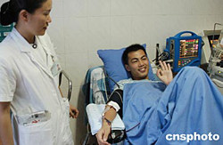 年僅十九歲、現(xiàn)就讀于廈門南洋學院的在校大學生張良建(右一),九月九日在福建醫(yī)科大學附屬協(xié)和醫(yī)院輸血科干細胞采集室內(nèi)接受造血干細胞采集,引起有關(guān)專家的重視。這是迄今為止福建省首例在校大學捐獻造血干細胞。據(jù)了解,福建省現(xiàn)有十三萬名患者等待造血干細胞移植,每年新增白血病患者約一千二百人。作者:劉可耕