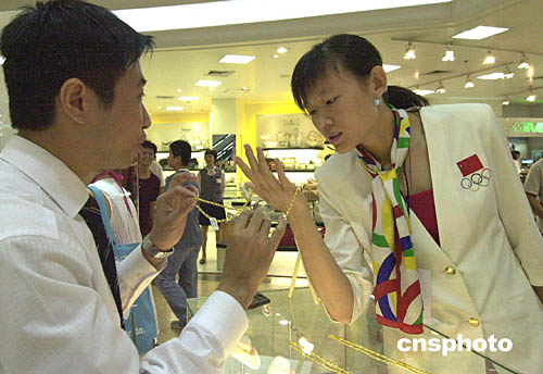 中國雅典奧運(yùn)金牌選手代表團(tuán)九日抵達(dá)澳門訪問,當(dāng)天下午部分選手到商場(chǎng)購物,跆拳道金牌選手羅微在選購金飾。作者:梁永強(qiáng)