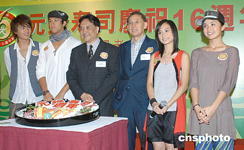 | Twins、Boy'Z兩對(duì)樂壇人氣組合9月9日在香港出席元綠壽司慶祝十六周年記者會(huì),元綠壽司行政總裁梅偉筠;英皇娛樂老板楊受成與元綠壽司代言人Twins、Boy'Z一同見證元綠壽司生產(chǎn)八億八千八百多萬(wàn)件之創(chuàng)舉。作者:鄧慶樂