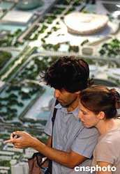 九月中旬,一對(duì)外國客人在剛落成不久的北京城市規(guī)劃展覽館內(nèi)觀看大型沙盤,并仔細(xì)“閱讀”北京奧運(yùn)村附近的規(guī)劃情況。北京城市規(guī)劃展覽館也將在本月展示并收藏從雅典接回的奧運(yùn)會(huì)會(huì)旗。中新社記者:張宇
