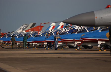 | 法國(guó)空軍的“法蘭西巡邏兵”飛行表演隊(duì)正式成立于1964年2月。飛行表演隊(duì)的飛機(jī)涂著同法國(guó)國(guó)旗一樣的紅、白、藍(lán)三種顏色,機(jī)群在空中做飛行表演時(shí)也常常把著三種顏色的煙跡留在空中。它象征著“自由”(紅色)、“民主”(白色)、“博愛(ài)”(藍(lán)色),體現(xiàn)了法國(guó)人民勇敢、浪漫的傳統(tǒng)和對(duì)未來(lái)美好的愿望。圖為表演結(jié)束后地勤人員正在作例行檢查和維修(來(lái)源:艦船知識(shí)網(wǎng)絡(luò)版)
