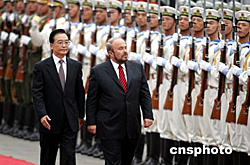 中國國務(wù)院總理溫家寶九月十三日下午在北京人民大會堂東門外廣場主持儀式,歡迎來訪的阿爾巴尼亞總理納諾。這是中阿總理三十八年來的首次會晤。中新社記者:毛建軍
