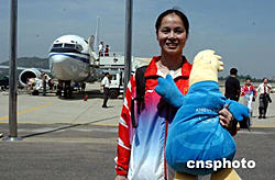 在第二十八屆雅典奧運(yùn)會(huì)上奪得女子蹦床銅牌的閩籍運(yùn)動(dòng)員黃珊汕,九月十三日攜雅典吉祥物載譽(yù)返閩抵達(dá)福州長樂國際機(jī)場時(shí),受到福建省各界人士的熱烈歡迎。作者:劉可耕