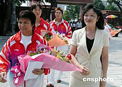 | 第二十八屆雅典奧運(yùn)會女子柔道五十二公斤級冠軍冼東妹的家鄉(xiāng)——廣東肇慶,九月十三日下午舉行盛大的歡迎儀式,并以六十萬元人民幣重獎自己的優(yōu)秀女兒冼東妹。圖為肇慶市副市長黃玲陪同冼東妹步入會場。據(jù)悉,肇慶市委、市人民政府授予冼東妹肇慶市勞動模范、“三八”紅旗手、“肇慶市杰出青年”等榮譽(yù)稱號。同時(shí),四會授予她四會市勞動模范、四會“三八”紅旗手、“四會市杰出青年標(biāo)兵”等稱號;四會石藝國際集團(tuán)贈送一套高級公寓給冼東妹。作者:黃耀輝