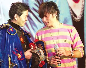 慶功會以京劇《大鬧天宮》開場,各路天王把周杰倫簇?fù)碓谥醒耄[喻“唯周杰倫獨(dú)尊”。隨后,川劇大師彭登懷的弟子上臺伴著《我的地盤》表演了變臉。站在臺側(cè)的周杰倫目不轉(zhuǎn)睛地盯著表演者,然后走到表演者身邊左看右看,最后干脆動手搜起身來。聽到觀眾的笑聲,周杰倫很不好意思地說:“等回家再把老師扒光了查!