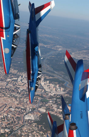 法國空軍的“法蘭西巡邏兵”飛行表演隊正式成立于1964年2月。飛行表演隊的飛機涂著同法國國旗一樣的紅、白、藍三種顏色,機群在空中做飛行表演時也常常把著三種顏色的煙跡留在空中。它象征著“自由”(紅色)、“民主”(白色)、“博愛”(藍色),體現(xiàn)了法國人民勇敢、浪漫的傳統(tǒng)和對未來美好的愿望。圖為“法蘭西巡邏兵”飛行表演隊作在空中垂直下降動作(來源:艦船知識網(wǎng)絡(luò)版)