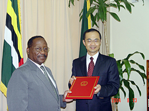葉大波大使首先向利物浦總統(tǒng)閣下轉(zhuǎn)達(dá)了胡錦濤主席和溫家寶總理的親切問候,并代表中國政府和人民向多米尼克政府和人民致以崇高的敬意和良好的祝愿。葉大使說,多米尼克國自獨立以來,為維護(hù)國家主權(quán)、振興民族經(jīng)濟(jì)進(jìn)行了不懈的努力,取得了重要成就。多政府奉行獨立自主的外交政策,努力發(fā)展同世界各國的友好合作關(guān)系,促進(jìn)了加勒比地區(qū)的穩(wěn)定和發(fā)展。中國政府和人民衷心祝愿多米尼克國在未來的歲月中取得更大的成就。