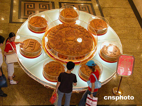 中秋將至,有“月餅泰斗”之稱(chēng)的廣州陶陶居酒家推出巨無(wú)霸月餅“七星伴月”,中間的大月餅直徑達(dá)168厘米、重318公斤。作者:劉衛(wèi)勇