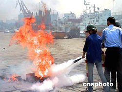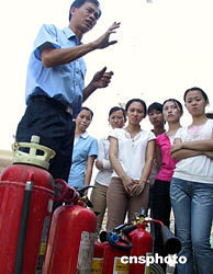 中國(guó)第一列跨;疖(chē)客運(yùn)列車(chē)即將開(kāi)通,應(yīng)聘的列車(chē)乘務(wù)員們九月中旬接受海南海事局海船船員專(zhuān)業(yè)知識(shí)培訓(xùn),這是消防教員在講解滅火器的操作。據(jù)了解,這些乘務(wù)員將成為國(guó)內(nèi)第一批擁有海船船員資格證書(shū),同時(shí)服務(wù)于陸地與跨海運(yùn)輸?shù)幕疖?chē)乘務(wù)員。作者:關(guān)向東