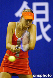 九月十八日,在“德意志銀行杯網(wǎng)球日”活動中,網(wǎng)壇新星俄羅斯十七歲的莎拉波娃與中國選手晏紫,在北京國家體育總局訓(xùn)練局網(wǎng)球館內(nèi)進行一場慈善表演賽,最終莎拉波娃以二比零取勝。圖為莎拉波娃在比賽中。中新社記者:盛佳鵬