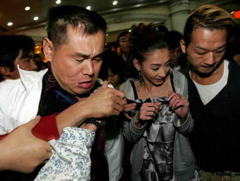 聽(tīng)說(shuō)張美人終于要下樓了,門口一片沸騰,當(dāng)張柏芝在幾位隨從人員的簇?fù)硐鲁鰣?chǎng)時(shí),現(xiàn)場(chǎng)炸開(kāi)了鍋,尖叫聲一浪高過(guò)一浪。大家的雙臂熱情地伸向張柏芝,快到門口時(shí),張柏芝身邊一位助手更是把她緊緊摟在懷里,剛到門口,立刻伸過(guò)來(lái)3只手向張柏芝胸口“進(jìn)軍”,大美女被嚇得花容失色,一位伸手企圖和張柏芝親密接觸的男子更是笑得比花還燦爛。