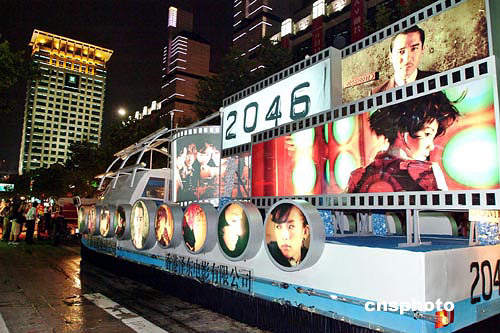 九月十九日晚,二○○四上海國際旅游節(jié)花車大巡游在一片歡慶的鑼鼓聲中閃亮登場,其中香港導演王家衛(wèi)的新作“2046”也借機在現(xiàn)場宣傳造勢。作者:湯彥俊