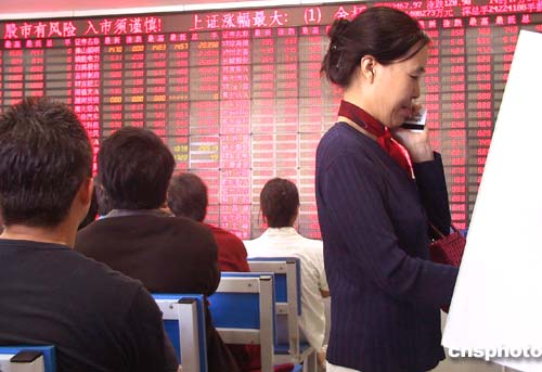 | 受利好消息的良性影響,九月二十日(周一),中國滬深股市大盤呈現(xiàn)出放量上漲的滿堂紅景觀。該日,北京股民神態(tài)自若地在證券營業(yè)部內(nèi)進(jìn)行交易。當(dāng)日兩市共成交約419億,比上一個交易日明顯放大。其中上證指數(shù)漲跌幅達(dá)+3.43%;上證B股指數(shù)漲跌幅達(dá)3.46%;深證成指漲跌幅達(dá)3.76%;深證成份B指漲跌幅達(dá)4.07%。中新社記者:鄒憲