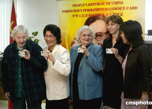 中新社北京九月二十一日電(記者 吳慶才)今天,北京市公安局出入境管理處為北京農(nóng)業(yè)機(jī)械化科學(xué)院的美國專家寒春等五名在京外國人頒發(fā)了《外國人永久居留證》。他們將與其他二十三名外國人一起成為首批在北京獲得“綠卡”的外國人。